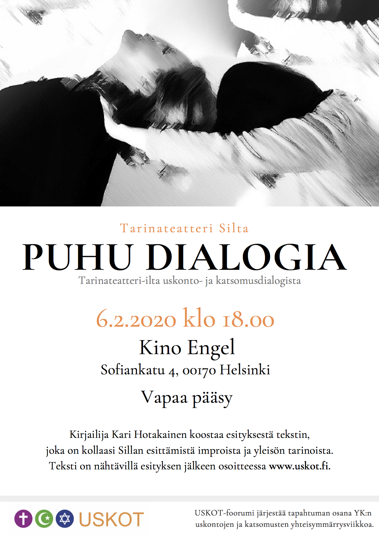 USKOT-foorumi järjestää yhdessä Tarinateatteri Sillan kanssa tarinateatteri-illan uskonto- ja katsomusdialogista osana YK:n Uskontojen ja katsomusten yhteisymmärrysviikkoa. Tilaisuuteen on vapaa pääsy.