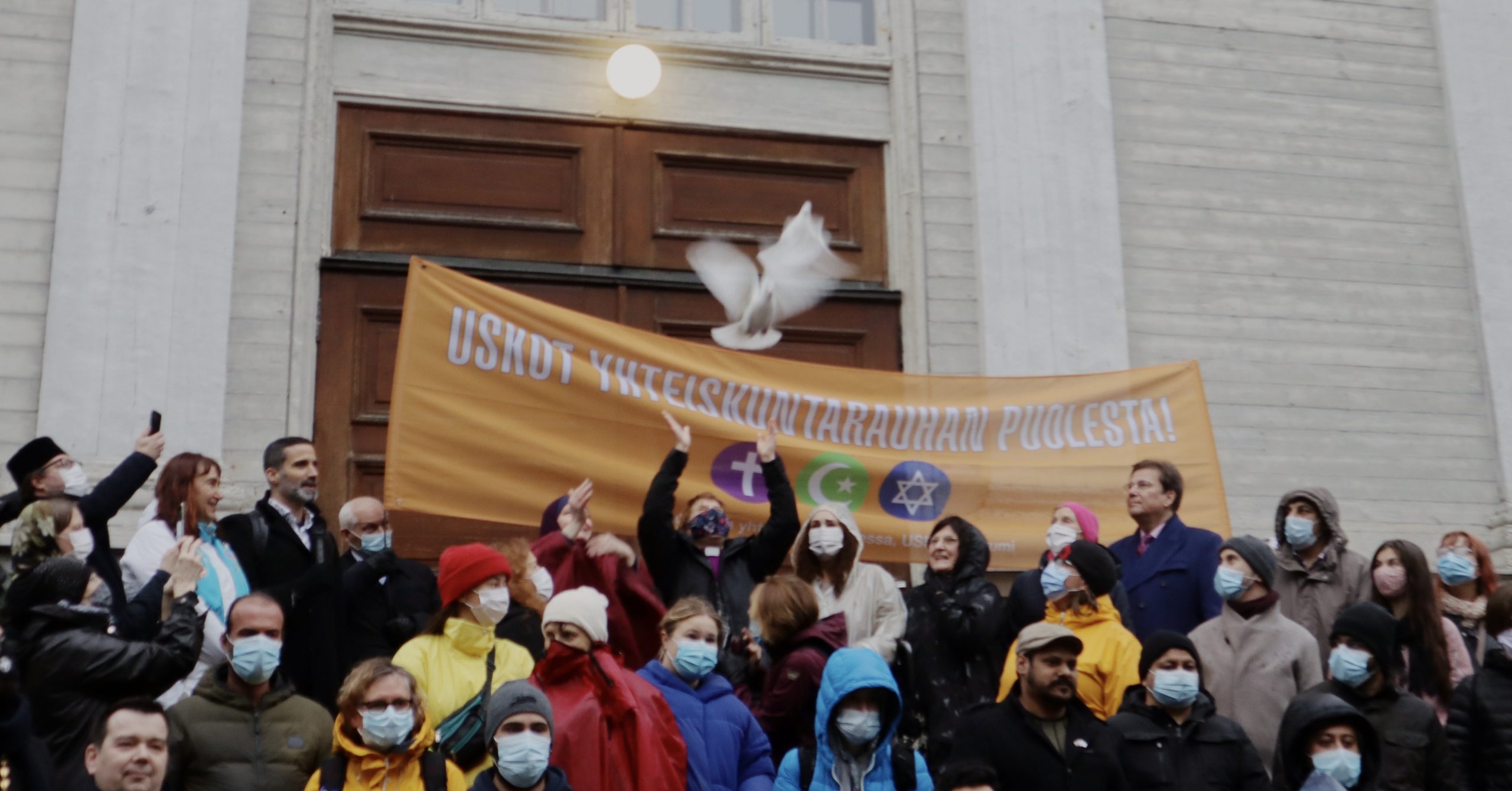Kävelyn lopuksi USKOT-foorumin varapuheenjohtajat Jardi ja Hintikka lähettivät lentoon kaksi yhteistä rauhaa symboloivaa valkoista kyyhkyä.